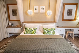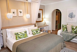 В каждом номере кровать king size, ванная комната с душем, фен, телефон, сейф, мини-холодильник, набор для приготовления чая/кофе, кондиционер и потолочные вентиляторы, ТВ, терраса или балкон с видом на сад и океан
